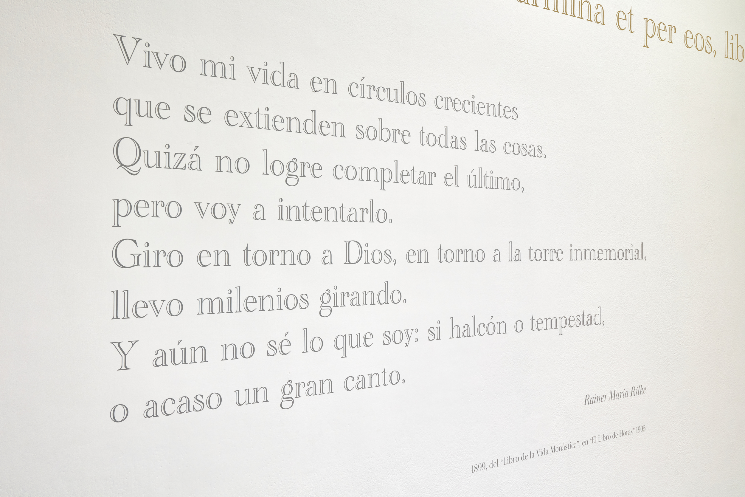Dans ses gravures, Pedro Peschiera ajoute l’esthétisme des mots à celui de la figure. Le langage verbal complète le langage pictural, mais sans jamais le remplacer. La première série, composée de sept gravures, joue sur les rapports d’opposition : entre les mots, entre la figure et le fond ou encore entre les qualités de présence et d’absence. Dans les six premières gravures la figure d’une maison est formée grâce à la différence dans l’intensité de la typographie, puis dans la septième, les mots ont disparus et ne reste qu’un gauffrage blanc sur blanc, produit par la trace laissée par le mot void –vide. Une manière subtile de dire la fragilité de tout discours. La quatrième gravure de la série juxtapose deux phrases. La première en français est une citation d’un sûfi du XI siècle: « En ne sortant jamais du commencement, l’on parvient à l’achèvement ». La deuxième phrase est en espagnol et est issue d’une opérette: «Ay, que trabajo nos manda el Señor, levantarse y volverse a acostar» – «Oh, quel travail nous envoi le Seigneur, nous lever seulement pour nous coucher à nouveau ». Les deux phrases se répètent comme une létanie sans fin. Deux registres bien différents, l’un profond et l’autre plus ‘léger’; une allusion au coté absurde de l’existence.